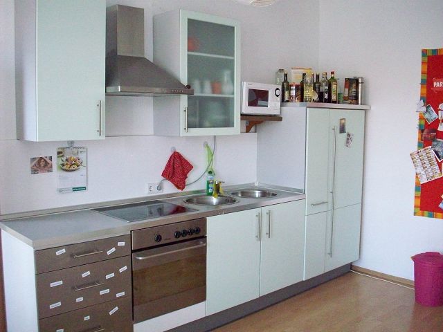 Große Wohnküche mit moderner Einbauküche (Nobilia Hellgrün/Lichtgrau und viel Edelstahl) mit Elektrogeräten. Im Flur ist viel Platz für Kleiderschränke, Bad mit Badewanne und Dusche, Waschküche im Keller und Kellerraum vorhanden. Kabel-DSL-Telefon-WM-Anschluss möglich.